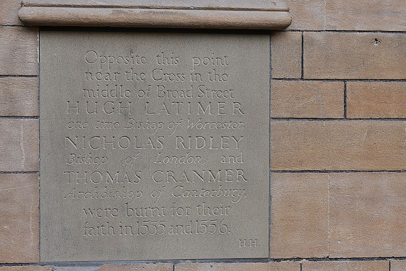 我這次參觀了兩所大學:牛津與劍橋。兩所大學也是淵源深厚。牛津大學建校歷史可能在1096年,於1209年時,一批學者因與牛津市鎮民發生衝突而往東出走,在劍橋郡的劍橋市另行籌設大學,便成為劍橋大學。我是在搭○○公司的火車直達牛津,出火車站沒多久就會看到有一小塊路面,在原本的柏油路面上保留了一塊小面積的石板路面。此處是為了反對瑪莉一世女王復辟天主教,不願屈服的教士們在此被火刑處死。後世為了紀念這些殉道人士,不但保留了這塊火焚的地面,並在旁邊立了殉道紀念塔(Martyrs’ Memorial)。